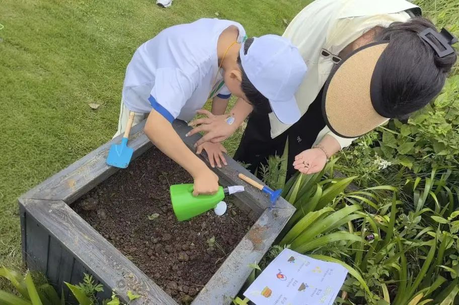 志愿者提前翻松花箱土壤,备好向日葵种子、儿童小铲、洒水壶等工具。按照分组顺序,孩子们来到花箱前,体验挖坑、播种、覆土、浇水的全过程。他们用小手铲挖出土坑,小心地放入种子,覆上泥土,再轻轻浇水。孩子们在动手实践中感受生命的力量,也学习了秩序、协作与耐心——每一粒种子都是希望的起点,每一次播种都是对未来的承诺。